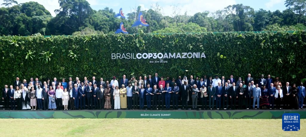 11月7日,嘉宾在巴西贝伦气候峰会上合影。为期两天的贝伦气候峰会7日结束,通过了关于饥饿、贫困和以人为本的气候行动宣言。包括中国在内的40多个国家和欧盟签署了一项宣言,推动采取行动应对气候变化的影响,包括饥饿和贫困。新华社发(卢西奥·塔沃拉提供)
